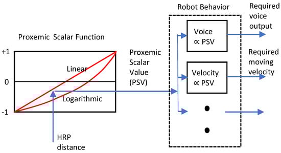 A method to adapt the behavior of a social robot based on HRP has been proposed in [80]. The method uses a proxemic scaling function to adapt the behavior. Two types of scaling functions, linear and logarithmic, as shown in Figure 13 have been considered. According to the Proxemic Scalar Value (PSV), corresponding to the HRP in a situation is used to adapt the behavior. Here, a robot’s behavior, such as moving velocity and voice output, is modified proportionally to the PSV. The performance of the proposed method has been evaluated through a user study. According to the outcome of the user study, both logarithmic and linear scaling functions are preferred over a system with no scaling in the aspects of user comfort and stress. In contrast, the logarithmic proxemic scaling function is preferred over the linear scaling function in terms of the robot attributes of intelligence, likability, proxemic awareness, and submissiveness.