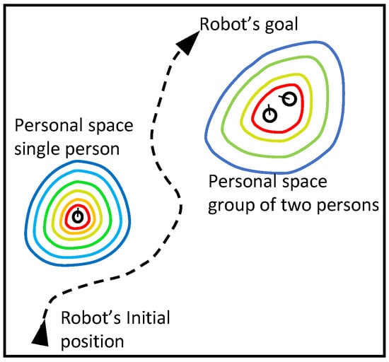A probabilistic method to determine a human-aware navigation path for a service robot has been proposed in [84]. The proposed method uses a social cost map around a person to minimize the invasion of a human’s social space during navigation. However, the method uses a fixed social cost map around a person in this regard. The HRP-aware navigation path planner proposed in [85] could enable a service robot to plan paths in environments populated with multiple persons. The HRP-aware path plan strategy can be explained with the aid of Figure 15. In this method, the personal space of an individual is represented by an asymmetric two-dimensional Gaussian function. When considering a group of humans, the individual Gaussian functions are combined through a Gaussian mixture. A path, which minimizes the overlap through the resultant personal spaces, is determined to navigate a robot to a goal. The validation of the proposed system is limited to simulations.