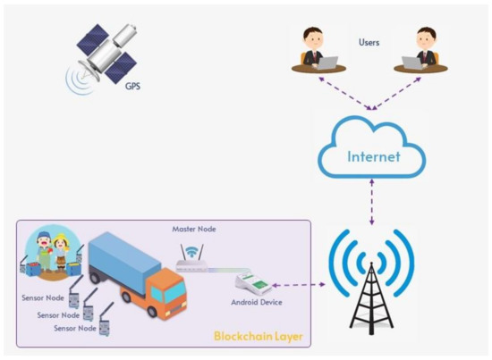 With the proposed system, data will be obtained from the devices in the food tracking containers, and this data will be collected on the blockchain-based system. Food tracking will be carried out not only on the vehicle but at all stages of the supply chain. The distribution of the obtained data will be delivered to the end-user through the servers (Figure 6).