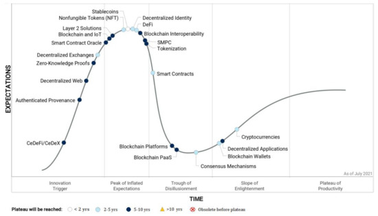- Litan, A. Hype Cycle for Blockchain 2021; More Action than Hype. Available online: https://blogs.gartner.com/avivah-litan/2021/07/14/hype-cycle-for-blockchain-2021-more-action-than-hype/ (accessed on 5 August 2021).