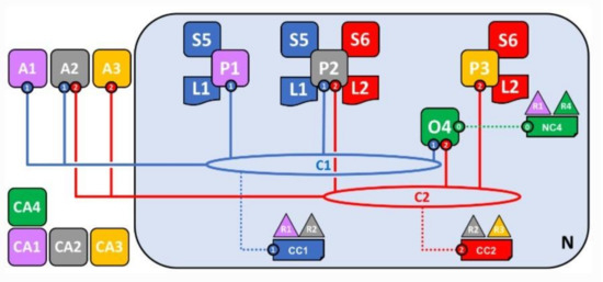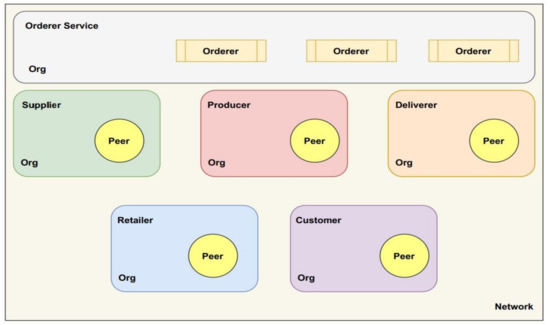 The latest version of a Hyperledger Fabric network, which was formed after all operations were completed, is given in Figure 9. First of all, an organization that will establish the N network is required. Here, the organization that established the network is R4. R4 organization starts O4 (Orderer Service) after setting NC4 (Network Config). O4 peers are responsible for installing the smart contract and ensuring consensus. R4, who has admin authority in the network, can share this authority with the R1 organization if they wish. The organizations symbolize companies or participants. If a channel is to be created, a consortium is established to show with whom this channel will be created. With this consortium, the participants of the channel can be determined. The configuration files of the channel are located in the “Channel Config”. In addition, organizations also have an MSP (Membership Service Provider). P1, P2, and P3 are machines here. Peers carry smart contracts (S5) and blockchain (L1) inside them. Smart contracts can read and write to the “World State” of the blockchain. Moreover, each channel is connected to the Orderer Service (O4) because O4 provides the consensus mechanism that keeps all peers in sync. A1, A2, and A3 are external participants, and they do this through peers thanks to the API. For this project, the producer can be considered as the manufacturer and the intermediary. Their access to the network can be restricted within the CC regulated by the organizations. As can be seen, an organization can be a participant in more than one channel. In this case, the peer belonging to that organization can keep more than one ledger (blockchain) and smart contract (chaincode) for separate channels.