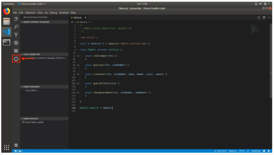 In Hyperledger Fabric, smart contracts are called “chaincode”. In Fabric, smart contracts can be executed with Go, Java, and JavaScript. JavaScript language was chosen to implement the application. Hyperledger Fabric features the IBM Blockchain Platform interface developed by IBM for rapid prototyping of smart contracts. This interface was installed on our system as a “VS Code” plugin (Figure 11).