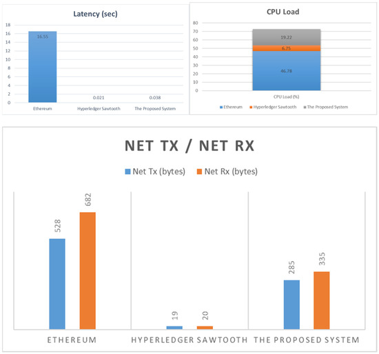 The latency (s) value in the proposed system was obtained as 0.038. The transmission per second value is 285, the reception per second value is 335, and the CPU load rate value is 19.22. Especially when we evaluate the latency times, the obtained value is at a very good level compared to Ethereum. When it is compared with Hyperledger Sawtooth, it is seen that there is a little more delay. The main reason for this is that the system architecture is more complicated, and the data size obtained is high. This is also evident from the fact that the transmission per second and reception per second values are much higher than Hyperledger Sawtooth. It has been observed that a rate of 19.22 was achieved in the CPU usage rate (Table 4). As a result, it is seen that the performance data obtained have a serious advantage over Ethereum, especially in terms of latency, and it has started to converge in other values (Figure 13). Considering that the real-time operation of the installed system is extremely important, the choice of Hyperledger Fabric has once again emerged as the right decision.