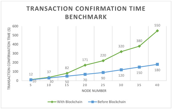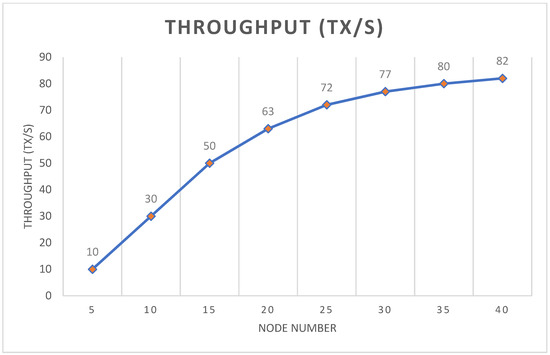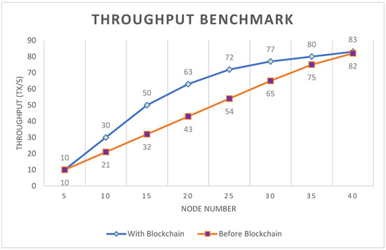 Secondly, the throughput value comparisons are performed. It is seen that the throughput increases proportionally before the blockchain layer is added. After adding the blockchain layer, it is observed that the efficiency is higher even before the blockchain in the low transaction and node numbers, but as the number of transactions and nodes increases, the acceleration gradually decreases and starts to become stable (Figure 18).