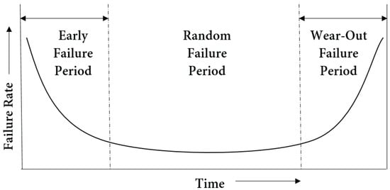 Devices or components malfunction relatively early on due to flaws in the design, manufacturing processes, or an incompatibility with the operating environment. These defects, known as the early failure period, are corrected by debugging during one of the production steps before shipments for aluminium electrolytic capacitors. The random failure period is consistent, rare, and does not seem connected to the term they have served. Aluminium electrolytic capacitors have experienced fewer catastrophic failures than semiconductors and solid tantalum capacitors. The failure rate during the wear-out period rises with operation time. The electrolyte impregnated in aluminium electrolytic capacitors steadily evaporates and diffuses out of the capacitors through the rubber seal materials since their production is finished, causing a decrease in capacitance and an increase in tan. The capacitors are defined as having “fallen into wear-out failure” when any of these values vary outside the acceptable range of specifications. Their useful life is the capacitors’ serviced period until they enter the wear-out failure period. The failure rate of aluminium electrolytic capacitors can be visualized using the bathtub curve as shown in Figure 1.
