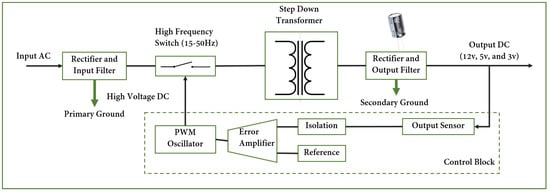 The input power is an alternating current (AC), and the output power is a direct current (DC) in this type of SMPS. This AC power is converted to DC using rectifiers and filters. The impacted power factor correction circuits are provided with this unmanageable DC voltage. This is because, near the peak of the voltage, there is a low current pulse inside the rectifier. This includes high-frequency energy, which has an effect on the power factor by lowering it. This is due to power conversion, although we used an AC input source rather than a DC supply. As a result, this block diagram uses a combination of a rectifier and filter to convert AC to DC, and a power amplifier is used to switch an operation [35].