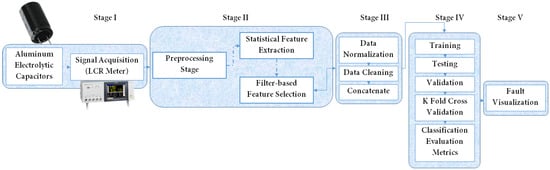 Figure 3 depicts the condition monitoring framework’s suggested architecture. In order to strengthen and improve the distinguishing characteristics amongst the chosen capacitors, filter-based feature selection was introduced. It is interesting to note that the model includes a stage for pre-processing data, three-way feature extraction, correlation-based feature selection, a different set of input variables, ML-based diagnosis, and performance testing of the chosen ML technique. The proposed integrated statistical and supervised learning model framework/approach involves a long-term frequency CM set at 8 MHz. To enhance and improve the performance of the selected models, a statistical approach involving time-domain features’ extraction from each dataset and filter-based feature selection was used to select the right features for training and testing the dataset. Furthermore, the stages of the framework can be categorize as follows: