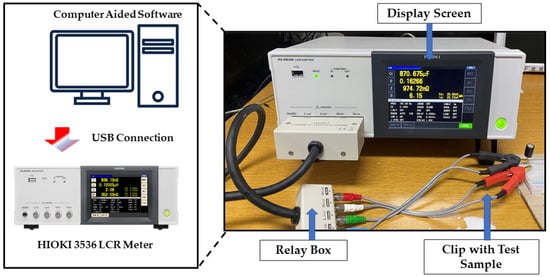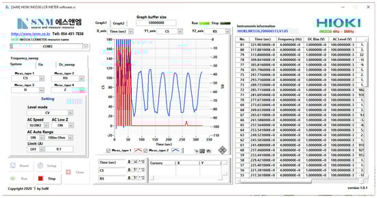 Stage B (Software)—the option to select at least four electrical signals at once for the monitoring of the SMPS-AEC. This involves selecting the capacitance (Cs), equivalent series resistance (Rs), dissipation factor (D), and impedance (Z). Other parameters selected in the data acquisition process are frequency/frequency step, DC Bias, signal level, measurement range, etc. Figure 6 shows an overview of the software program used in the data acquisition process. First, the USB connection is programmed with the LCR meter, then an electrical signal is selected for each measurement type. Afterwards, the voltage mode to be applied across the test sample is selected which could either be a constant voltage (CV) across the test sample or a varying voltage mode (V). Other important parameters include the acquisition speed of the test sample (SLOW2, FAST) and low impedance is set to ON due the capacitance value of the selected capacitors.