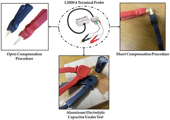 The data acquisition process in Figure 4 consists of an offline condition monitoring for SMPS-AEC using the advanced HIOKI 3536 LCR meter. By sensing the current flowing to the measurement target and the voltage across the measurement target’s terminals, LCR meters can determine the impedance (Z) and phase angles. They then calculate measurement variables, including inductance (L), capacitance (C), and resistance (Rs), using the Z and phase angle data. Since the equipment cannot determine which model is most appropriate for a given measurement objective, the equations utilized to calculate these measurement parameters vary depending on whether the instrument is in a series equivalent circuit mode or a parallel equivalent circuit mode. The user must select the suitable equivalent circuit mode to minimise measurement error. The impedance (Z) has a real section (Rs) and an imaginary section (X), and its parameters can be calculated by expanding it on a complex plane [41]. Equations (1)–(5) represent the impedance relationships.