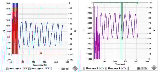 Figure 7 shows the visualization of the four electrical signals captured using the software program with the advanced HIOKI 3536 LCR meter. The capacitance (Cs) against the equivalent series resistance (ESR) is on the left while the dissipation factor (D) against the impedance (Z) is shown on the right.
