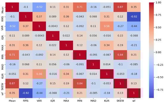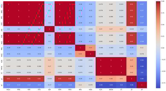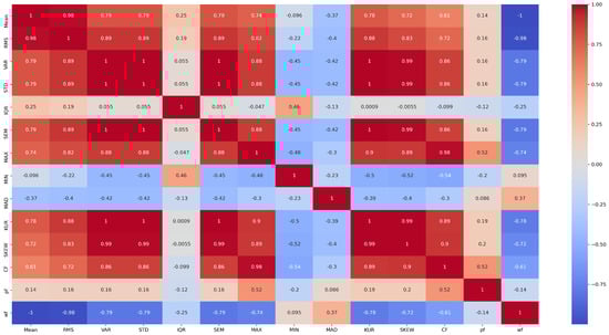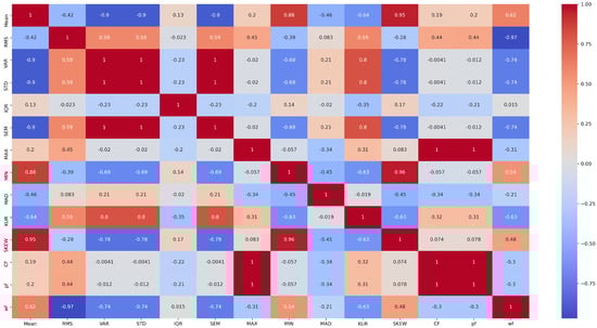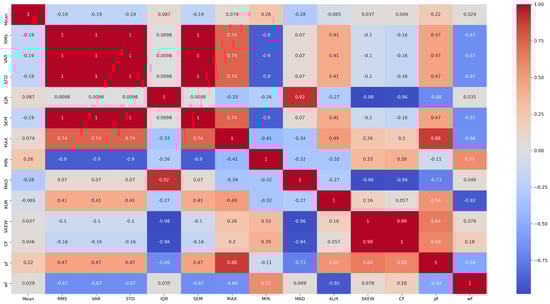 Figure 10 shows the correlation of the thirteen (13) time domain features extracted from the ESR dataset. The features selected based on the set correlation are shown in Figure 11, with a total number of 10 features namely, mean, root mean square, variance, interquartile range, maximum, minimum, median absolute deviation, kurtosis, skewness and wave factor. The correlation coefficient in red has a positive value of 1, with the less negative coefficient of −1 represented in blue. In addition, the color coding of the heatmap shows the necessary relationship among the variables and reveals linearity and non-linearity.