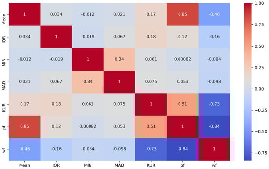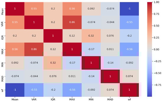 Figure 12 shows the correlation relationship among the time-domain statistical features extracted from the impedance dataset. From the heatmap, it can be deduced that there were a greater number of higher numerical values in the range of 0 to 1 and a lower number of numerical values in the range of 0 to −1. Notwithstanding, using the correlation coefficient set using the filter-based approach, the best features were selected as shown in Figure 13. The 7 features selected were mean, variance, interquartile range, maximum, minimum, mean absolute deviation, and wave factor. Overall, the color coding was able to show the linear relationship among the numerical variables.