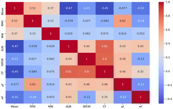 It is a feature engineering method that gauges how well two sets of values can be distinguished from one another. Correlation matrices are meant to show positive and negative values of the statistical features if available. The measurement parameter is termed a Pearson correlation coefficient that ranges between −1 to +1. Once an F-score value is provided, features greater than the set score will be dropped during feature selection. A specific F-score will be used to determine each feature. The likelihood that this trait will be more discriminative increases with the size of the F-score. The features will then be arranged in ascending order, and the scores will be used to choose which features to employ. To classify types of data, the time domain statistical features were extracted from the capacitor datasets and are shown in Table 4. Equation (6) was used to carry out the selection of the best features after their linear correlation. The positive linear matrix shown in the correlation means there is a strong relationship between the variables extracted. A similar correlation matrix can be seen in [11,13] and in statistical feature extraction application [42,43,44,45].