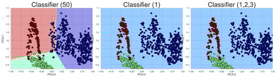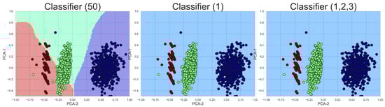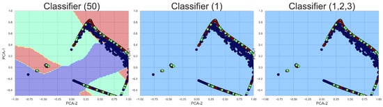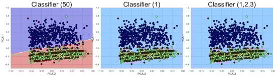 Interestingly, most of the selected model’s prediction had an accurate score across the metrics. There was a need for a further avenue to select the right electrical parameter for the aluminum electrolytic capacitors, hence the feature reduction and fault visualization process using the principal component analysis (PCA). PCA is a technique that helps in reduction from a high dimension to a low dimension in terms of the number of features. The feature selection plot as shown in Figure 9, Figure 11, Figure 13 and Figure 15 had 10, 10, 7 and 7 features selected, respectively. With the aid of the PCA, these features were reduced to two for the fault visualization and feature reduction. PCA 1 and PCA 2 show the label reduction plot for feature 1 and 2, respectively, with references to their Figure 18, Figure 19, Figure 20, Figure 21 and Figure 22. Initially, the training data were deployed on multi layer perceptron (MLP) but demonstrated poor prediction across each electrical signal. However, we deployed its various hidden layers to plot the fault for each electrical signal. The MLP classifier had hidden layer sizes in the range of 50, 1, and 1,2,3 as shown in the Figure 18, Figure 19, Figure 20, Figure 21 and Figure 22.