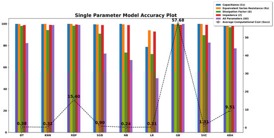 Table 10 shows the classification report for the selected supervised learning algorithm using the combination of the overall dataset with input parameters of capacitance, ESR, impedance and dissipation factor. Interestingly, the KNN, RDF and GB models had the best prediction accuracy (98.83%, 99.11% and 99.89%) and computational cost (0.4133, 16.0533, and 103.2333 s), respectively. Figure 22 shows the fault visualization plot for the whole dataset and significantly could not discriminate within the dataset. Looking closely at the visuals, it can be seen that there are less clusters in red and green and more blue clusters. This can can be attributed to the statistical feature extraction and selection process as most discriminating features were dropped during the feature selection process. Hence, the approach cannot be recommended for use even though some of the algorithms had good accuracy values. Figure 23 shows the accuracy bar plot of the single features approach with the capacitance in blue, equivalent series resistance in yellow, dissipation factor in green, impedance in red, and all parameters in purple. Overall, it can be seen from the plot that the three supervised algorithms, namely KNN, RDF, and GB, had consistent accuracy in comparison.