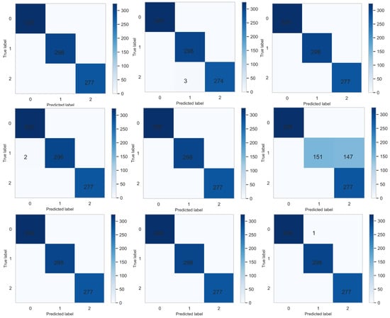 Additionally, in terms of computational cost, the KNN model along with its consistency had the lowest average value of 0.32 s while the GB model had an average of 57.68 s but with a more consistent accuracy among the five parameters. Although it is a reliable place to start, classification accuracy frequently faces issues in practice. The fundamental issue with classification accuracy is that it obscures the information required to fully comprehend how well a classification model is performing. With three or more classes, an accuracy of classification of 80% may be achieved, but it is difficult to determine if all classes are predicted equally well or if the model is neglecting one or more classes when the number of classes in the data is not evenly distributed. If 90 out of every 100 records belong to one class, an accuracy of 90% or more may be reached, but this is not considered a good score until the value of the most prevalent class is consistently anticipated. Classification accuracy may obscure information required to assess a model’s effectiveness. Fortunately, a confusion matrix can help in such circumstances. A method for summarizing a supervised learning classification algorithm’s performance is called the confusion matrix. If a dataset has more than two classes or if each class has an unequal amount of observations, classification accuracy alone may be deceiving. A better understanding of the categorization model’s successes and failures can be obtained by calculating a confusion matrix. Figure 24 shows the confusion matrix for the equivalent series resistance (ESR) dataset due to its ability to provide good prediction across all the supervised learning algorithms, including the decision tree model (DT), k nearest neighbors (KNN), random forest (RDF), stochastic gradient (SGD), naive Bayes (NB), logistic regression (LR), gradient boost classifier (GBC), support vector classifier (SVC), and Adaboost classifier.