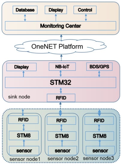 According to the framework of IoT, the network frame of the proposed scheme is divided into four parts: data acquisition layer which includes sensor nodes and sink nodes, communication layer which is NB-IoT station, application layer which is IoT cloud platform and user layer which is the monitoring center. The sensor node is the detection terminal which is used to detect the information around the sensor and send these information to the sink node. The sink node is used to receive the information from the sensor nodes and compress the information and send it to the IoT cloud platform. The whole hardware frame of the monitoring system is shown in Figure 1. The monitoring system includes one monitoring center which is in PC, and two mobile carriages. Each carriage includes one sink node and three sensor nodes. The sensor node is mainly composed of a stm8 MCU, a temperature and humidity sensor, a RFID module and lithium battery. Stm8 controls the temperature and humidity sensor to collect the temperature and humidity information nearby, and then send the information to the sink node through the RFID. The sink node is mainly composed of a stm32 MCU, a TFT display panel, a RFID module, a BDS/GPS module, a NB-IoT module and battery. Stm32 receives the temperature and humidity information from the sensor node through RFID and gets the position information from BDS/GPS module, then compresses and sends these data to the OneNET cloud platform through the NB-IoT module. The monitoring center is in PC. The temperature and humidity of each sensor node, the sink node position can be acquired in monitoring center by accessing the cloud platform. My SQL database is used to manage current and historical data. Real time map of each mobile carriage can also be displayed.