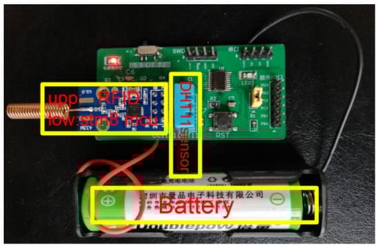 The hardware of monitoring system includes two parts, one is the sink node hardware, the other is the sensor node hardware. The hardware of sink node includes stm32f103c8t6, cc1101 RFID module, wh-nb75-ba NB-IoT module, at6558 BDS/GPS positioning module, TFTLCD display screen, key module, 3.3 V voltage regulator module and several LED lights. The system is powered by 5 V battery. The physical hardware is shown in Figure 2. The wh-nb75-ba can access mobile developer platform OneNET for free, communicate with MCU by UART and configure with AT instruction set []. The positioning data collected by BDS/GPS module and temperature and humidity data sent by sensor nodes are sent to NB-IoT module through UART port during UART interrupt, and finally uploaded to cloud platform. At6558 chip is used in the positioning module with BDS/GPS dual positioning mode to obtain higher positioning accuracy. It is a real six in one multi-mode satellite navigation and positioning chip, which contains 32 tracking channels and can receive global navigation satellite system (GNSS) signals of six satellite navigation systems at the same time, and realize joint positioning, navigation and timing. This chip has high sensitivity, low power consumption and low cost, which is suitable for vehicle navigation, hand-held positioning and wearable devices []. The chip communicates with MCU through UART serial port. The baud rate of UART serial port is set to 9600, and the data format is strictly in accordance with international NMEA0183 standard. It is a low power chip. The working current is less than 23 mA, the sleep current is less than 10uA. RFID module cc1101 is a kind of RF application which is lower than 1 GHz for ultra-low power consumption. It has high data transmission speed and long transmission distance. It is connected with MCU through 4-wire SPI interface and provides two universal digital output pins with configurable functions []. The 2.3-inch TFTLCD is a color LCD, which can exchange data with MCU through SPI interface. CH340 is used to down load the program in the PC to the stm32. In addition, some LED lights are used to indicate whether modules are connected successfully or not. Some keys are used to reset system or initialize modules.