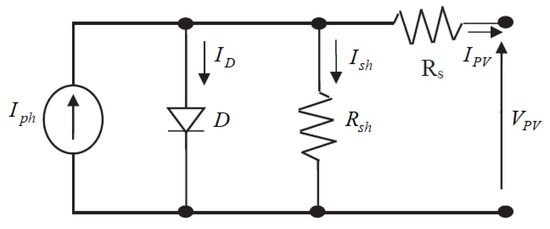 A single PV cell is shown in Figure 2 and its output current is described by the following equation [8,9,10,11,15,16,17,18,19,20,21,22]