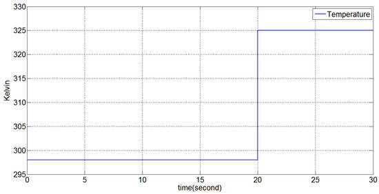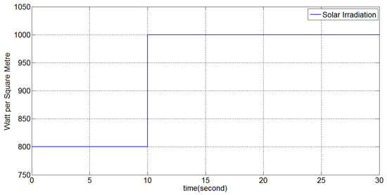 In addition, , , and all the observer initial values are set to zero, i.e., and . For a reliable comparison, two simulations are carried out using dynamic SMC and conventional SMC, both based on the same DSO observer. Both simulations are carried out with Matlab using a step size of 0.001. The solar irradiation and the cell temperature are shown in Figure 4 and Figure 5. The solar irradiation has increased from to at time , and the temperature has increased from to at time .
