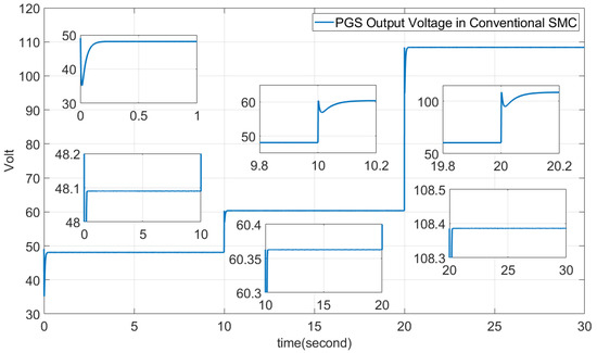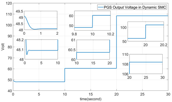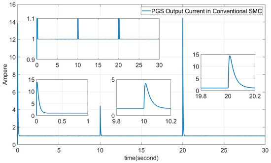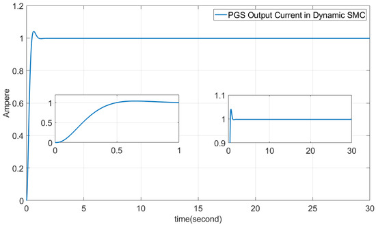 The sliding surface coefficients are selected as , , and ; in addition, we choose and . Moreover, to calculate the input control signal from the Equation (35) we need an initial value selected as . The results are presented in Figure 6, Figure 7, Figure 8 and Figure 9. Figure 6 shows the output current of PGS, which is tracked the and Figure 7 and Figure 8 present the output voltage of PGS and the smooth duty cycle of the converter. We can see that when the output voltage of PGS increases, the duty cycle decreases. This causes the output voltage of the converter to remain fixed at . The convergence of sliding surface to zero is shown in Figure 9. We can see that all the figures in this example are without chattering.