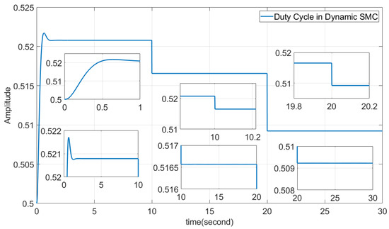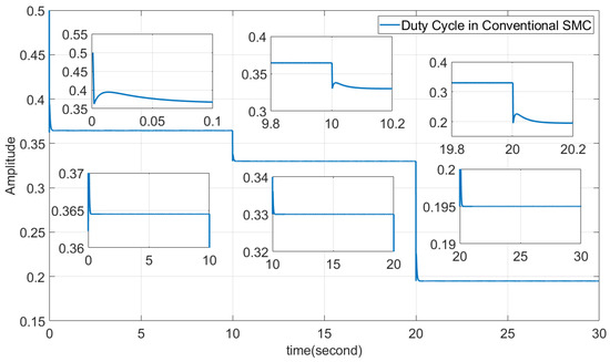 For calculation of input control duty cycle, we first calculate variables in Equations (32)–(34) using the observer Equation (21). Then input can be obtained from Equation (35) for dynamic SMC and from Equation (40) for conventional SMC.