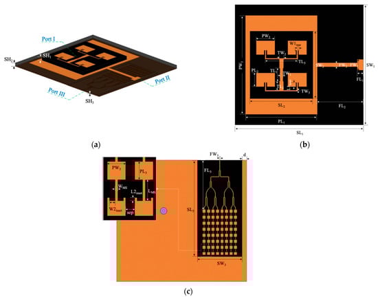 Dimensions and geometry of proposed low-profile triple-frequency antenna from (a) dimetric view, (b) top view, and (c) bottom view.