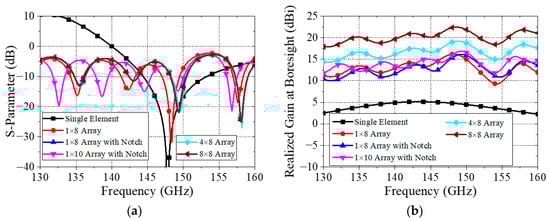 Figure 5 shows the S-parameter and the realized gain at the boresight (θ,φ = 0) of a single patch element, the one-by-eight array with and without the inset feed, the one-by-ten array with the inset feed, the four-by-eight array with the inset feed, and the eight-by-eight array. As the element increases from 1 to 8, the −10 dB impedance bandwidth changes from a single resonant frequency range of 144.4–153 GHz (bandwidth of 8.6 GHz) to a multiple resonant frequency range between 134.8 and 158 GHz (bandwidth of 7.1 GHz). Compared to the one-by-eight array without a notch, the one-by-eight array with a notch tunes the resonance closer to the desired frequency, improves the depth of the second resonance, and increases the realized gain between 136 and 145 GHz, and 149 and 158 GHz. As the number of series elements increases from eight to ten, the resonant frequency ranges below the frequency of 147.5 GHz shift from left to right, while the resonant frequency at 148.5 GHz stays the same. On the other hand, for frequencies above 155 GHz, the resonant frequency ranges decrease as the number of series elements increases. Due to the higher number of series elements for the one-by-ten array, a higher realized gain is observed compared to the one-by-eight array. Thus, the desired resonance frequency ranges and realized gain are achievable by manipulating the number of series elements. Eight series elements are arbitrarily chosen to show the effectiveness of the series-fed antenna array with other shared patch antennas.
