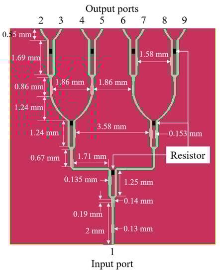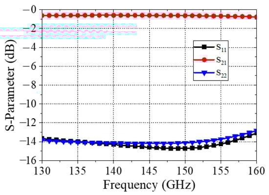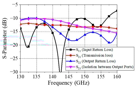 A modified one-by-eight 50Ω Wilkinson power divider is designed according to the topology described in [16], as shown in Figure 6, for mmWave applications. The main modification is the addition of a microstrip segment with Z0/ intermediate impedance that is placed just before the input transmission line is split into two lines. As shown in [16], this addition allows the rest of the power divider to use a Z0 impedance rather than the √2Z0 impedance, which is traditional for Wilkinson power dividers. However, because the width of a 50 Ω microstrip at 150 GHz is almost equal to λg/4, the mitered curve initially described in [13] to create the transmission line split is not viable. Therefore, the design is further advanced such that the 3λg/4 length used to split the transmission line is realized with a single, straight arm rather than 90° turns. This power divider was then cascaded to form a one-by-eight divider. Figure 7 shows the S-parameter of the developed one-by-eight Wilkinson power divider. The designed power divider shows suitable impedance matching at the input (S11) and output port (S22) of −10 dB or below, good isolation (S23) of −10 dB or below between output ports, and slightly higher transmission loss (S21) of −12 dB than that of the ideal power divider of −9 dB in the frequency ranges from 130 to 157 GHz. Higher S21 may be attributed to an impedance mismatch and harmonics, as reported in [17].