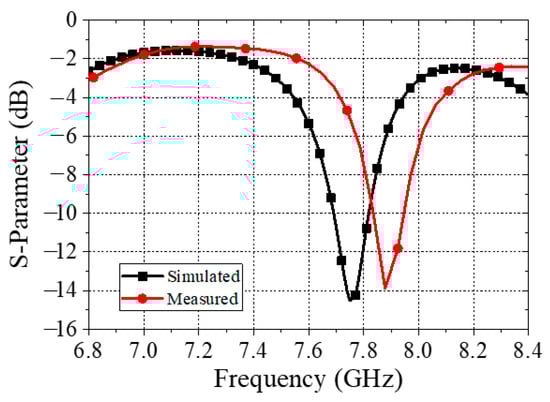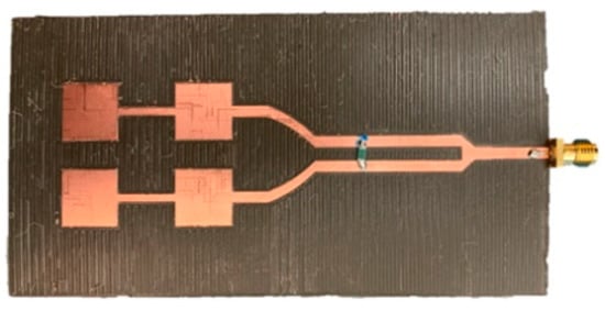 The design was reduced to a two-by-two array with a one-by-two power divider, scaled up, and fabricated, as shown in Figure 8, to verify the simulated performance of the developed Wilkinson power divider. Figure 9 shows the simulated and measured S-parameter of the two-by-two array with a one-by-two Wilkinson power divider. As shown in Figure 9, the simulated and experimental results agree well. A slight discrepancy may be attributed to the effects of the SMA connector, tolerance of the milling machine (~0.25 μm on the X- and Y-axis [18] and 10–20 μm on the Z-axis) that uses mechanical drill bits to mill the copper on the substrate, and fabrication imperfection.
