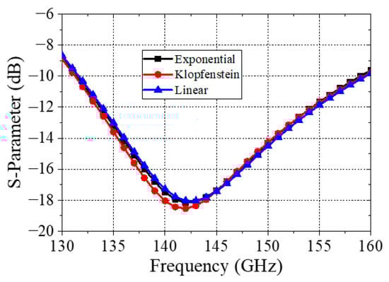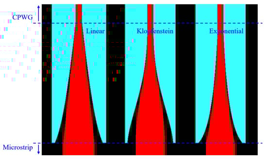 As the antenna frequency reaches the THz range, the SMA connector is no longer viable due to the small size and high operational frequency of the antenna. To circumvent this, a Waveguide Infinity Probe, selected from Microtech, fed the eight-by-eight 6G array antenna using a ground–signal–ground (GSG) topology. A coplanar waveguide to microstrip (CPW to MS) transition was designed to integrate the power divider with the GSG probe. Three different CPW to MS transitions were developed based on a Klopfenstein function, an exponential function, and a linear function, as shown in Figure 10, using the principles outlined in [19,20], for a coplanar waveguide with the ground (CPWG). Using a CPWG makes fabrication easier since the copper cladding on the bottom side does not need to be altered.