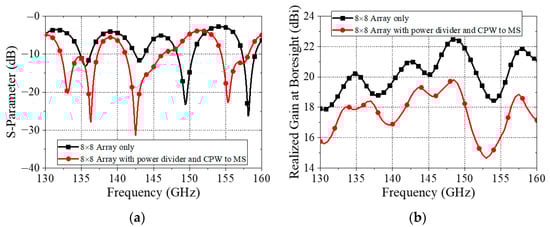 (a) S-parameter and (b) realized gain at boresight of eight-by-eight array with or without power divider and CPW to MS transition.