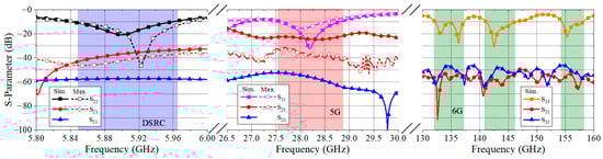 Figure 16 shows the simulated and measured S-parameter of the developed antenna. As shown in Figure 1, ports 1, 2, and 3 are for 5G, DSRC, and 6G frequency bands, respectively. The measured results show a reasonably good agreement with the simulated results. The simulated 10 dB impedance bandwidths are 0.11 GHz (5.85–5.96 GHz) for the lowest DSRC frequency band, 1.17 GHz (27.62–28.79 GHz) for the middle 5G frequency band, and 14.81 GHz (131.91–137.56 GHz, 140.53–146.87 GHz, and 153.06–155.88 GHz) for the highest 6G frequency band. The measured 10 dB impedance bandwidths are 0.12 GHz (5.85–5.97 GHz) for the lowest DSRC frequency band and 0.9 GHz (27.6–28.5 GHz) for the middle 5G frequency band. Further, it is noted that the simulated S21 shows values 5 to 20 dB higher than the measured S21. This is mainly attributed to the introduction of the 6G antenna array. Compared to the simulated S21 reported in our previous paper [7], the simulated S21 in Figure 16 shows a higher S21.