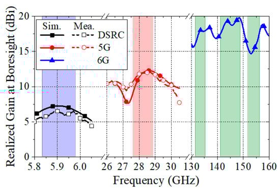 Figure 17 shows the peak realized gain at the boresight of the developed triple-frequency antenna. The simulated peak realized gain ranges from 6.74 to 6.87 dBi at the DSRC frequency band, 9.1 to 12.3 dBi at the 5G frequency band, and 15.1 to 19.8 dBi at the 6G frequency band. The measured peak realized gain at boresight is 5–6 dBi at the DSRC frequency and 10.1–12 dBi at the 5G frequency band. A slight difference between the simulated and measured results is mainly attributed to the minor effects from the SMA connector and soldering, non-uniform substrate thickness from mechanical drill bits (10–20 μm), and fabrication imperfection.