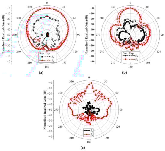 The simulated and measured E-plane normalized radiation patterns of the designed antenna at 5.9 GHz, 28 GHz, and 154.5 GHz are shown in Figure 18. Broadside radiation patterns with 20 dB or higher front-to-back ratios are observed. Further, −15 dB of cross-polarization levels at the boresight are also observed at all frequencies, indicating directional radiation desirable for telematics applications.