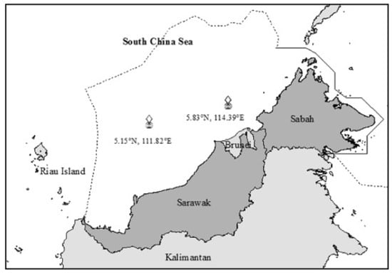 On a 2° × 2° grid in South China, environmental data are collected along Malaysia’s east coast, including the basins of Sabah (longitude 114.39° E, latitude 5.83° N) and Sarawak (longitude 111.82° E, latitude 5.15° N) (Figure 2). The Malaysian Meteorological Service and Fugro OCEANOR provided the data that was acquired from satellite altimetry [25,26] using oceanographic SEAWATCH meteorological (metocean) buoys and sensors, calibrated and corrected by Fugro OCEANOR [27].
