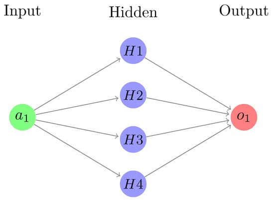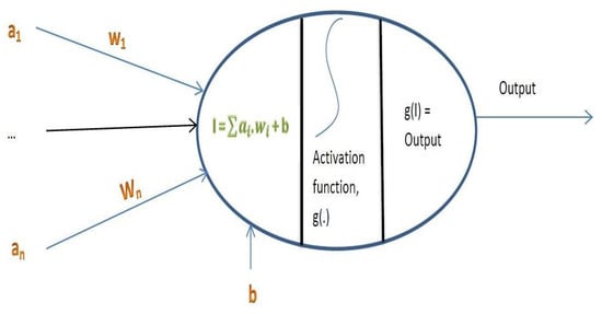The basic idea behind a single artificial neuron is that it takes an input function I, which is a product of weight vectors with the sample input vector, and feeds it into an activation function g to produce an output (Figure 3). Generally, the usual practice is to create a network of neurons based on many layers: input layers, hidden layers, and output layers. The input layers basically consist of one or more neurons based on the supplied inputs (for the present study, only one input is used), then there can be one or more hidden layers (only one hidden layer is used), and finally, there can be one output layer consisting of the expected outputs (Figure 4). The general trend is to use a back-propagation algorithm to update the weights involved in each connection between neurons so that it is possible to minimize the errors of regression between true output and the predicted output.