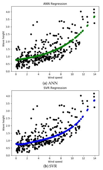 The regression results of ANN, SVM, and RF for wave height are depicted in Figure 8. Figure 8a shows the ANN regression findings for wave height. The black dots are actual testing data, and the green dots are the predicted values. It is clear that the predicted values follow the pattern of the actual testing data. Nevertheless, the regression results for the SVM regressor are shown in Figure 8b. The black dots are actual testing data, and the blue dots are the predicted values. It is clear that the predicted values follow the pattern of the actual testing data.