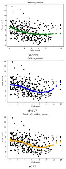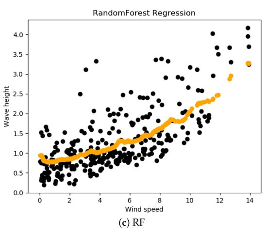 The regression results of wave height based on the RF regressor are presented in Figure 8c. The black dots are actual testing data, and the orange dots are the predicted values. It is clear that the predicted values follow the pattern of the actual testing data. The pattern is not as smooth as SVM or ANN because RF is not a single decision tree method; rather it is an ensemble method that works by taking the average of different decision trees’ predictions.