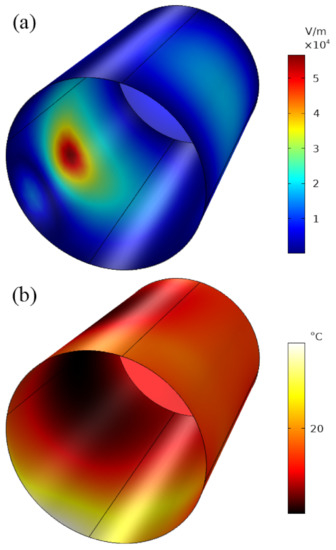 Electromagnetic–thermal distribution on the FTU internal surface: (a) electric field distribution on the FTU internal surface; (b) thermal distribution on the FTU.