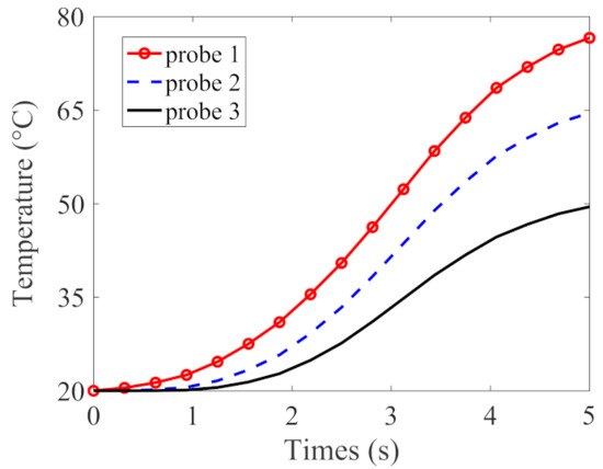 Finally, in order to quantitatively observe the heating process of different materials, we set up three probes on different CPU parts. Probe 1 is placed in the copper alloy, which is located in the center of the packaging structure; probe 2 is placed in the ferroalloy, which is located around the package structure; and probe 3 is placed in the PCB substrate, which is located at the bottom of the package structure. As shown in Figure 5, the temperature of all three probes increased with time. However, because the copper alloy is located in the center of heat conduction and has the highest thermal conductivity, the temperature of probe 1 rises rapidly from room temperature to 76 C. The PCB substrate has the lowest thermal conductivity and is located at the back of the CPU, thus temperature changes are relatively minimal. It can be seen that the external injection of an intense EMP may easily cause a sudden energy accumulation, which may have a serious impact on the performance of electronic and electrical equipment inside the FTU.