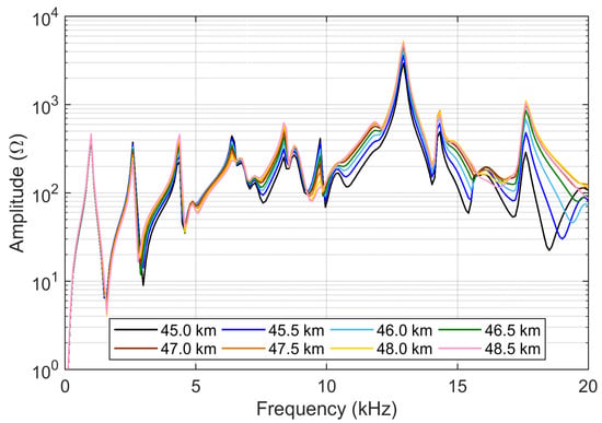 Line impedance curves of test case 1 [13] for positions along the line from 45.0 km to 48.5 km. Note the closer similarity of curves in the last positions beyond 47 km.