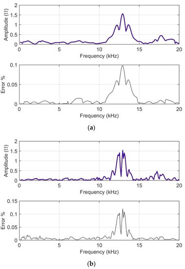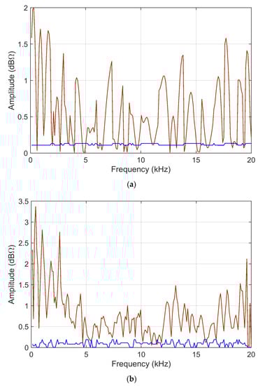 Two impedance curves are taken that are very close to each other, thus showing values of ADM and FDM that are at least 4–5 times smaller than those of the previous section (Section 6.1.1.), referring instead to more different impedance curves. ADMi and FDMi amplitudes for analytical and MCM calculations are shown in Figure 8. Figure 9 reports the ADMi and FDMi sensitivity curves. Figure 10 shows sk and ku for ADMi and FDMi calculated on the new alike impedance curves.