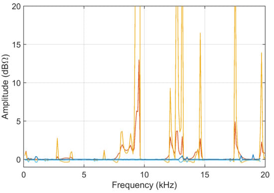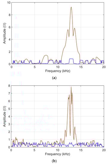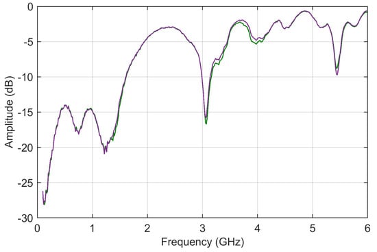 S11 curves are characterized by broad humps and deep downward peaks (see Figure 11). The two curves refer to a very similar configuration so that they have only one interval in the middle of the frequency axis, where they differ; other small differences are hardly visible. The curves, contrarily to those of railway impedance, proceed from negative values to zero with a smaller overall variation; they are also characterized by some deep dips.
