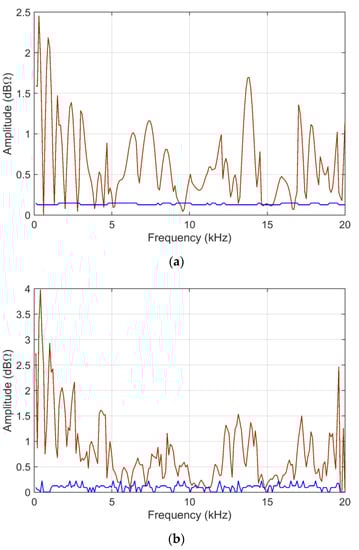 For this first set of data, a thorough check is performed for the influence of the logarithmic compression of data, for which ADMi and FDMi are provided below in Figure 3, and also for the logarithmic case. The logarithmic compression has enhanced the differences between the curves occurring at lower amplitude, namely between 16 and 20 kHz, and now prevailing over those occurring between 10 and 15 kHz. It is evident, however, that the ADMi and FDMi values are smaller when logarithmic compression is used (see Figure 3), simply because the absolute value of the input data is smaller.