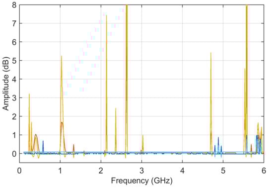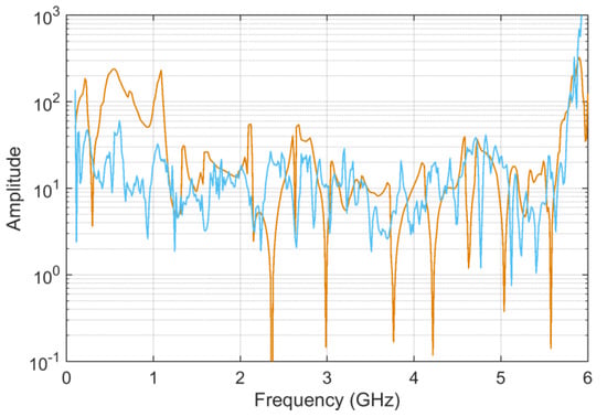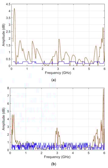Regarding the behaviors of the ADMi and FDMi curves, they are positioned in a range of values well below unity (due to the logarithmic scale and the similarity of the two selected curves). The two curves are selected so that they have a localized smaller difference in amplitude along the upward slope between 1.2 and 1.5 GHz, and a larger one of between about 3.2 and 4 GHz; then, they feature a difference of amplitude in the two downward peaks at 3 and 5.5 GHz. In addition, the downward peaks are very steep.