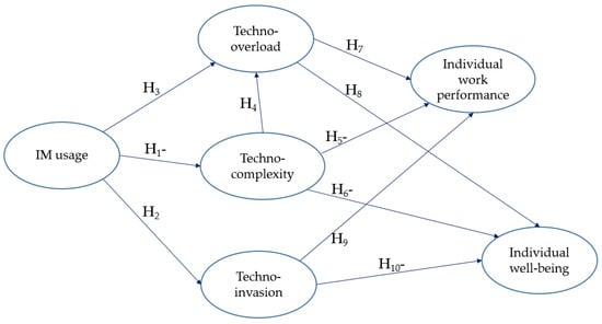 To our knowledge, no previous study has analyzed in detail the complete relationships between IM usage, technostress, and individual work performance and well-being. Given this research gap, we formulate our research question as “What are the effects of technostress related to IM usage on individual work performance and individual well-being? Do they differentiate for remote workers and office workers?” Our research used the Structural Equation Modelling technique in order to reveal the above-mentioned relationships.