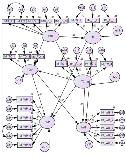 To validate the model, we calculated the representative values of several indicators used in the SEM methodology in the literature. The goodness-of-fit indicators of our proposed model have the following values calculated in AMOS: χ2/df ratio is 2.994 (χ2 = 859.18, df = 287), TLI = 0.915, GFI = 0.843, AGFI = 0.808, CFI = 0.925, RMSEA = 0.073. The thresholds we have considered for estimating the model fit are based on the established values in the literature [62]: TLI (Tucker-Lewis Index) = 0.900, χ2/df ratio < 5.00, GFI (Goodness of Fit Index) = 0.800, AGFI (Adjusted Goodness of Fit Index) = 0.800, CFI (Comparative Fit Index) = 0.900. According to [63,64,65], for RMSEA, the values ranging from 0.05 to 0.08 are considered acceptable and suggest a reasonable model-data fit. Given the thresholds set in the scientific literature and the actual values we obtained from the calculations for our model, it can be said that our proposed model is good fit.