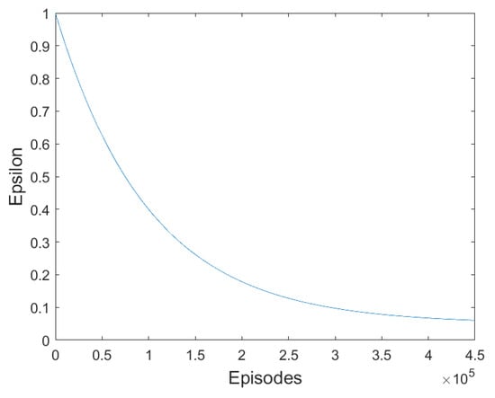 where, , are the minimum and maximum epsilon, respectively, and denotes the decay rate. The decay rate defines the rate at which will decay [39]. We use an exponential decay rate by which the probability of exploration reduces as the episode proceeds [41,42]. In our model, we set , , and to 1, 0.05, and 0.00001, respectively.