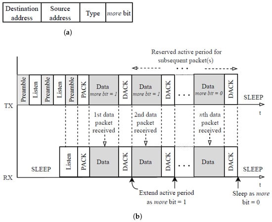 The frame header structure of QX-MAC is depicted in Figure 2a. Similar to WiseMAC, the QX-MAC frame header contains an extra control field carrying a single bit (more bit) flag to indicate the sender’s queue status (i.e., the number of packets in the queue). When the sleep time is over, a node wakes up and enters into the CCA state to check the activity in the medium. If no preamble is detected during the CCA period, the node checks its queue status after CCA timer expires. If the node’s queue is not empty, it moves to SEND_PREAMBLE state and starts transmitting a series of short preambles with small gaps in between to listen for the preamble-ACK (PACK) from the target receiver. To receive a data packet, a potential receiver must need to listen to a complete preamble. After detecting a short preamble, the intended receiver sends back an acknowledgment (PACK) and remains awake to receive the upcoming data packet from its sender. On receipt of the PACK, the sending node stops sending short preambles and switches to the SEND_DATA state to transmit a data packet. If the sender has more packet(s) in its queue for the same receiver, it sets more bit to 1 in its data frame, thereby signaling the receiver to extend its active mode for the next data packet from it, as shown in Figure 2b.